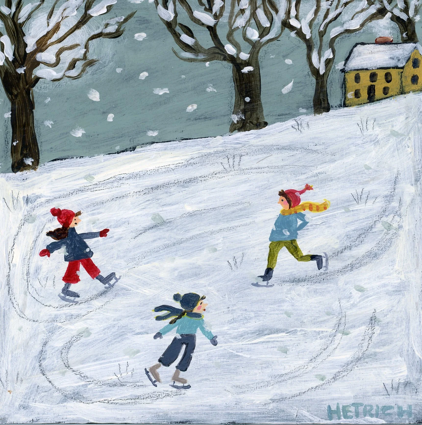 This one is titled “Yard Skating” because our entire yard became a solid sheet of ice. You could walk on top of what looked like just snow and make no footprints. This of course was quite dangerous and we really had to be careful on all our walkways and even just walking the dog in the yard to go potty. So I thought of this painting how you literally could skate in the yard. I saw online where several people literally did that! I know when I look at this painting in the future it’ll make me smile and remember that crazy storm that turned everything into an ice skating rink.