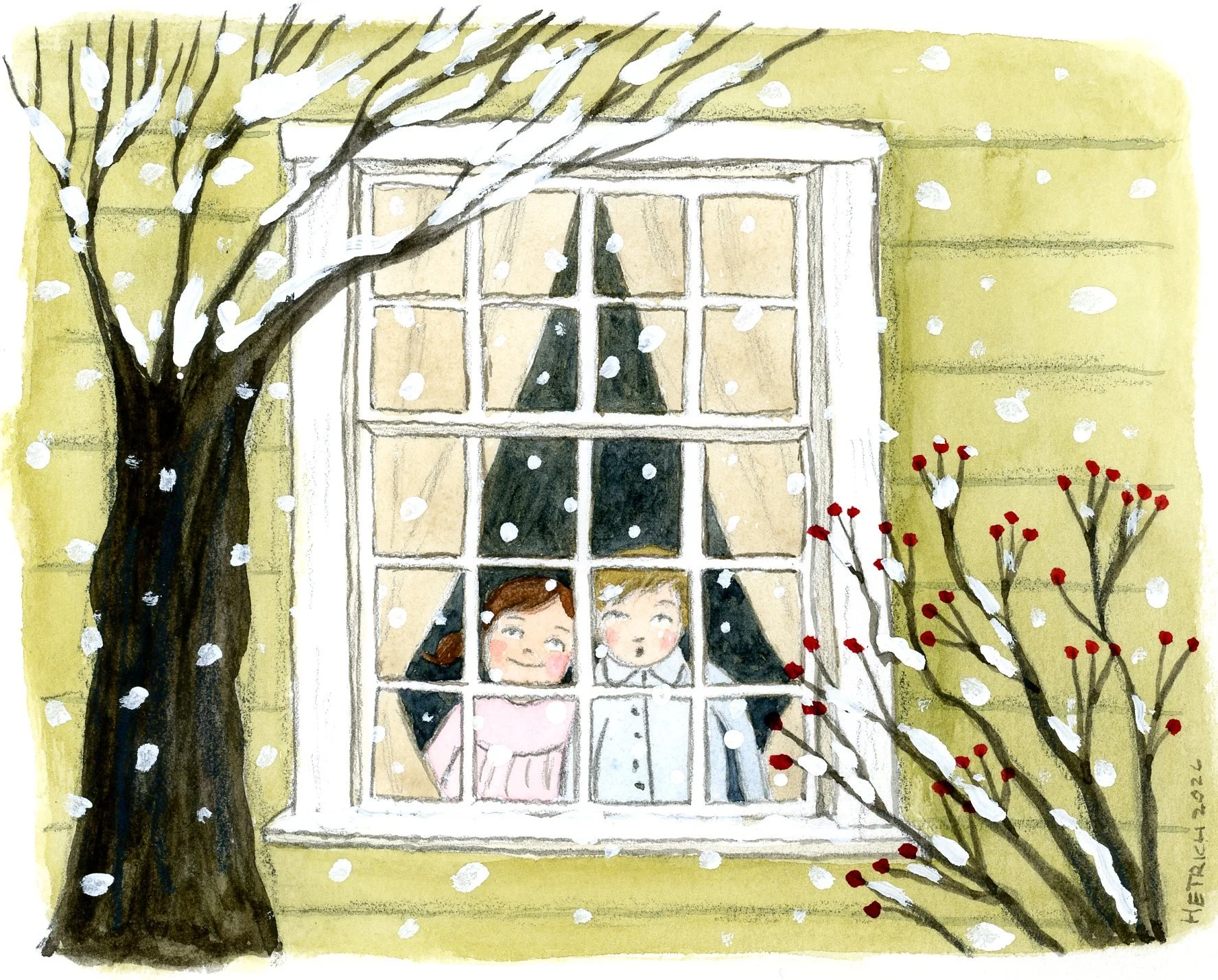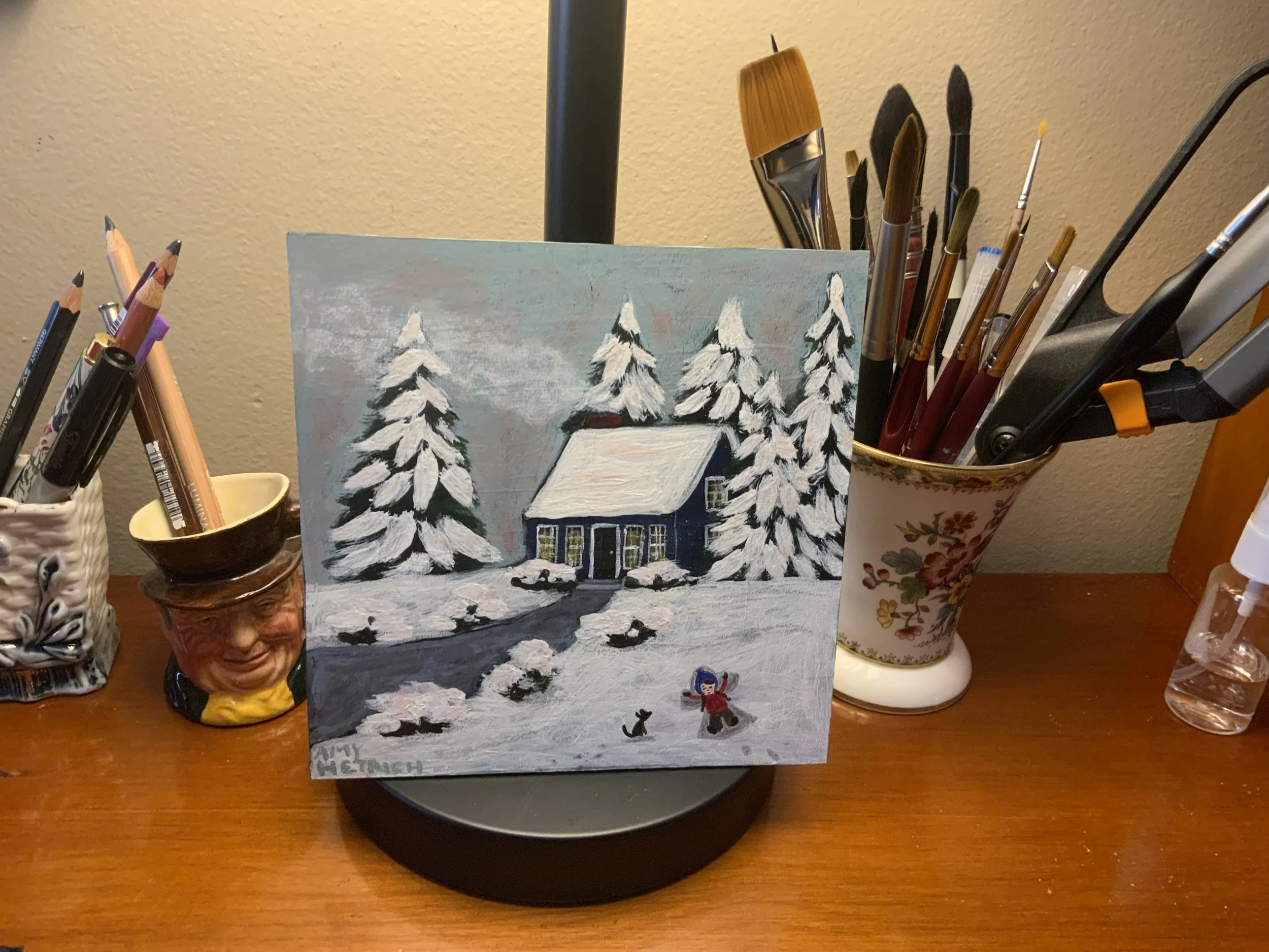In this painting we had just had our first big snowstorm of this year. I am an absolute snow lover and will always be probably the first one out in it. This painting took shape as I reminisced over all the times my kids or myself if I am to be honest would just stare out the window in aw of the snow. It truly is magical and mesmerizing to watch. When I look at this painting it gives me good memories and brings me to a peaceful time.