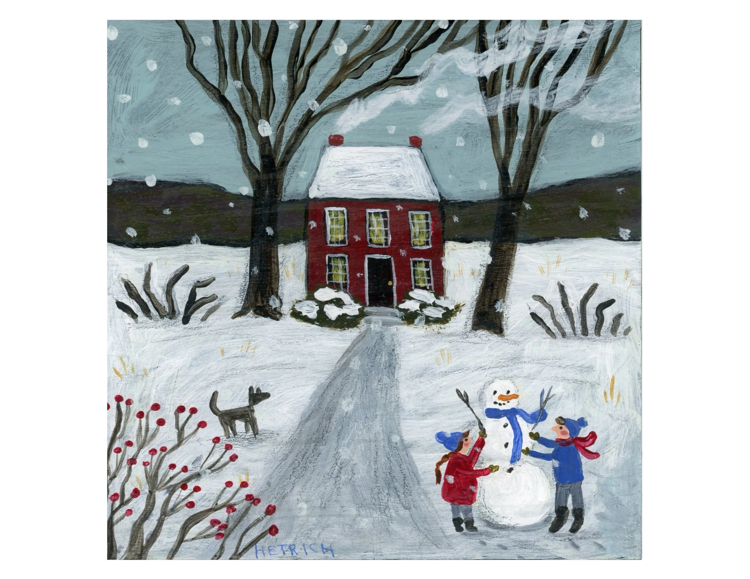 This last one I am going to show you is titled “Snow Much Fun.” This one was inspired by my New England trip to Cape Cod and I discovered this new neighborhood that had the cutest cranberry colored colonial. If I could move I would choose this house. It looks like it is from another time period. I knew I wanted to paint a scene that reminded me of good times where children couldn’t wait to get out into the fresh fallen snow to have so much fun. Building a snowman was always a must. I always smile when I see kids out in the snow having fun. It truly warms my heart.